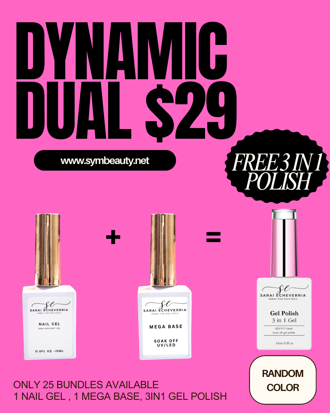 Includes 1 nail gel, 1 mega base and a free random 3 in 1 gel polish