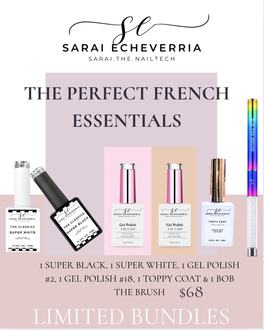 1 Super Black, 1 super white, 1 Gel Polish #2, 1 Gel polish #18, 1 Toppy coat & 1 Bob the brush